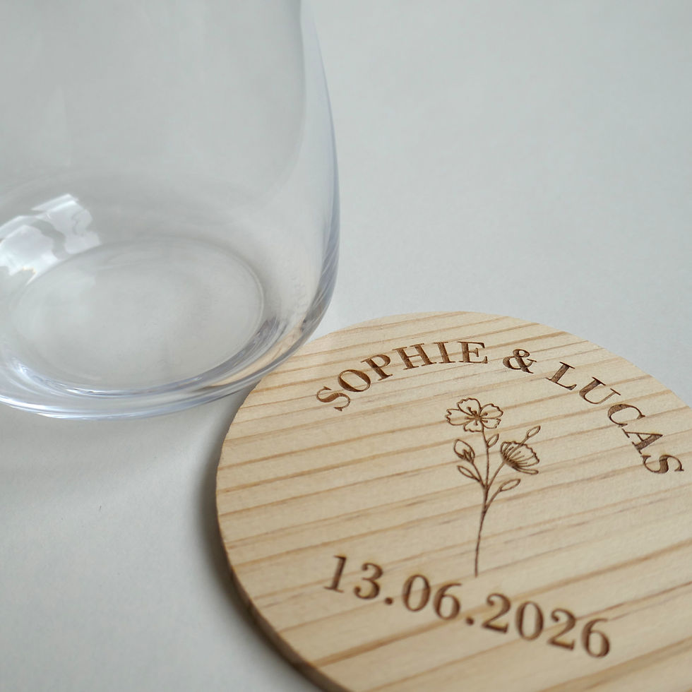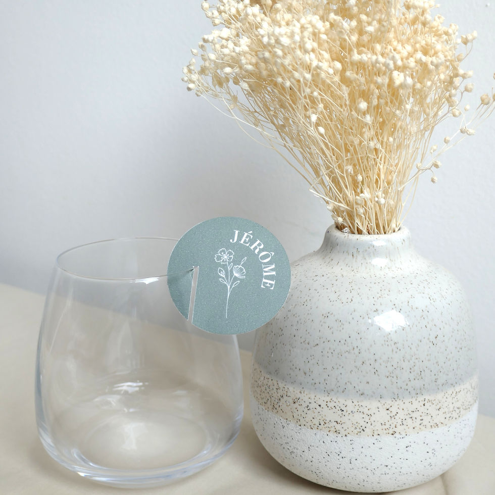 Créés dans notre atelier français, ces marque verres sur tranche format rond en bois gravé ajoutent une touche naturelle et authentique à votre décoration de table. Chaque disque rond avec prénom gravé se fixe délicatement sur le bord du verre et crée un souvenir durable à conserver après votre mariage. Parfaits pour un mariage romantique, bohème ou champêtre.
